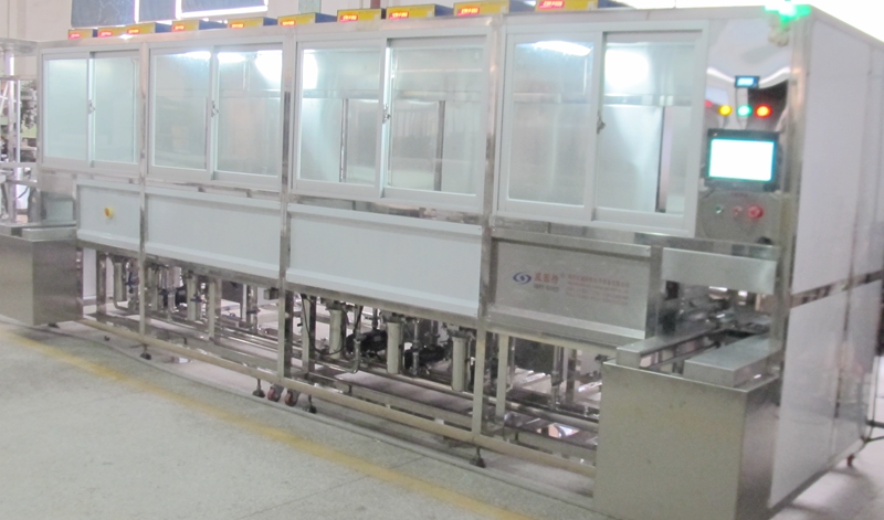 人工進料→洗劑超聲波粗洗→洗劑超聲波精洗→純水鼓泡漂洗→超聲波漂洗→離心干燥→人工出料。