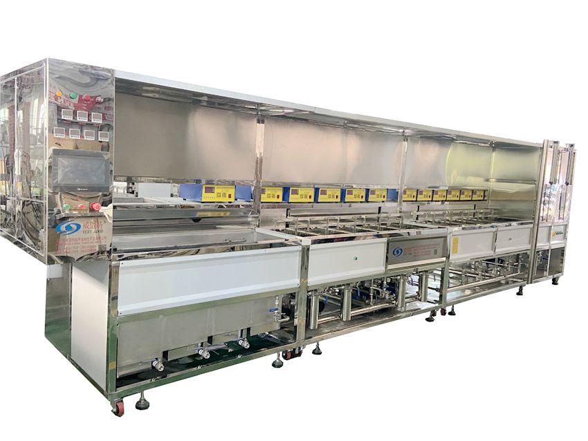 高頻電感多槽式超聲波清洗機高頻電感多槽式超聲波清洗機是利用超聲波在液體介質中的空化效應。液體介質所到之處對物體內外表面進行物理清洗,特別適用于清洗表面形狀復雜的工件,如對于精密工件的徽孔、狹縫、凹槽、盲孔,用常規的清洗方法難以奏效。